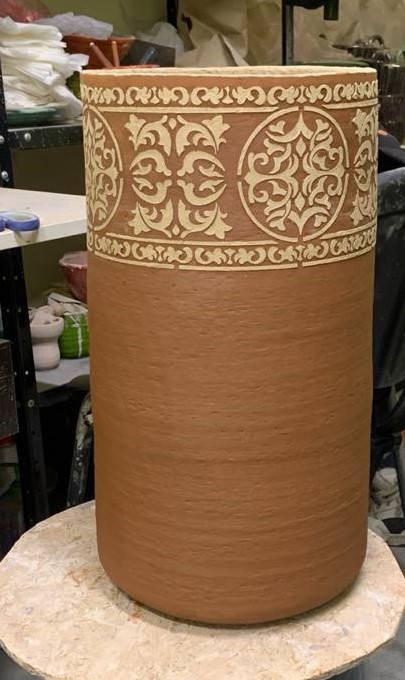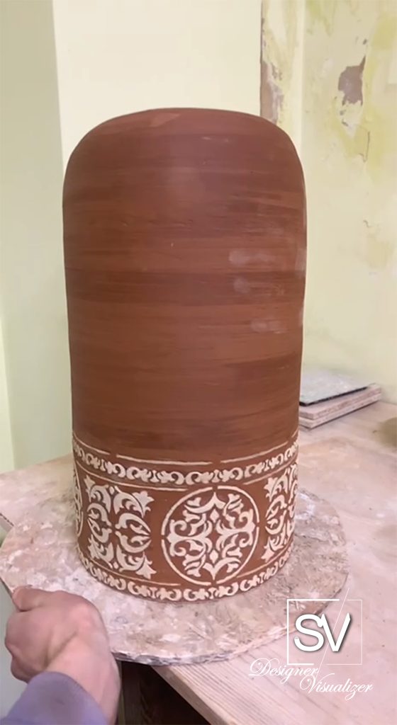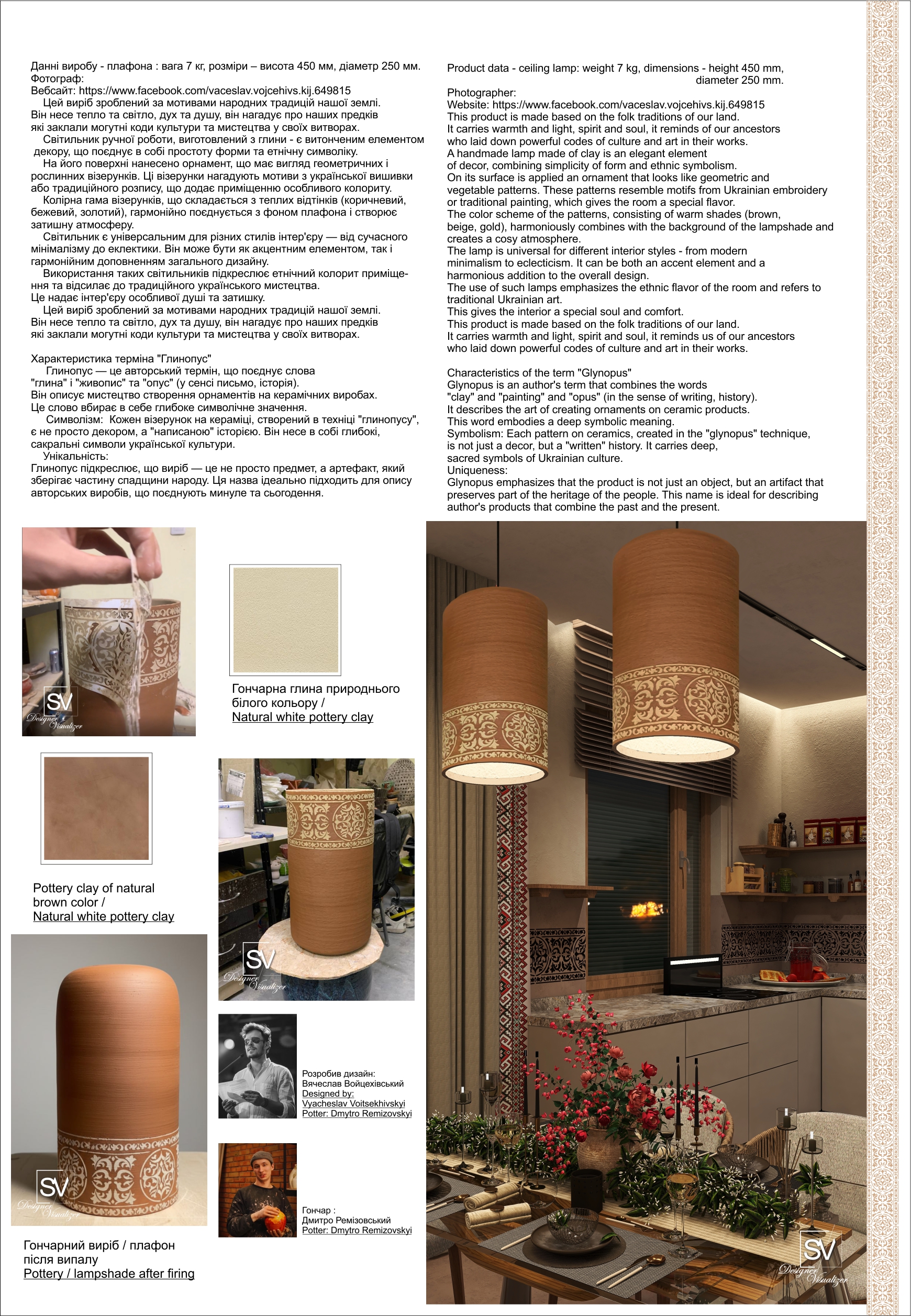 Світильник виготовлений з глини — натурального, живого матеріалу. На його поверхні нанесено орнамент, що поєднує геометричні та рослинні візерунки. Ці мотиви нагадують елементи традиційної української вишивки чи розпису, додаючи виробу автентичного колориту й культурної глибини.